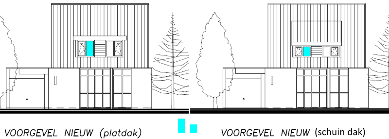 Aan de andere kant is een schuin dak wel mooier vinden wij dus daar zal de keuze tussen gemaakt moeten worden door de taxateur. We geven als suggestie om het ontwerp met schuin dak te maken waarbij de ramen grotere blijven, wellicht even groot als de linker optie. Dan is het dak wat minder schuin en misschien iets minder mooi (alhoewel) en dan heb je het voordeel van beiden.